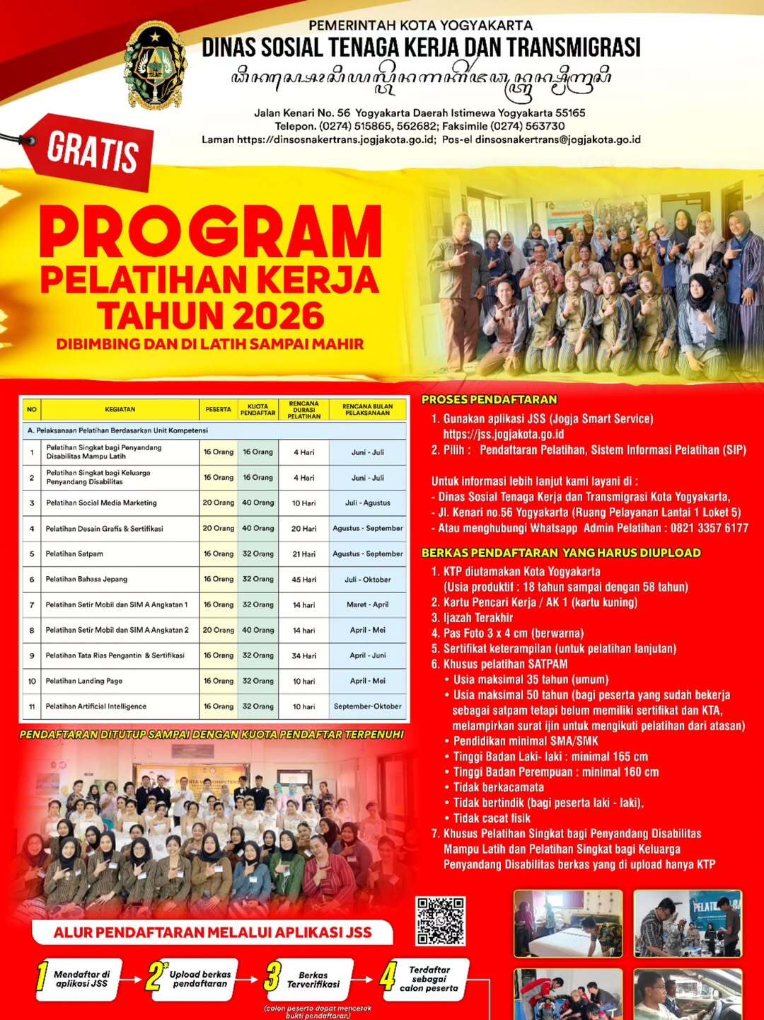 Pemerintah Kitha Yogyakarta lumantar Dinas Sosial Tenaga Kerja lan Transmigrasi Kitha Yogyakarta malih mbukak kalodhangan tumrap warga masyarakat kanggo melu Program Latihan Kaprigelan Nyambut Gawe Taun 2026. Program menika dipunajokaken dhateng warga Kitha Yogyakarta ingkang kepengin ngundhakaken kaprigelan sarta ngambakaken peluang nyambut gawe menapa dene usaha.